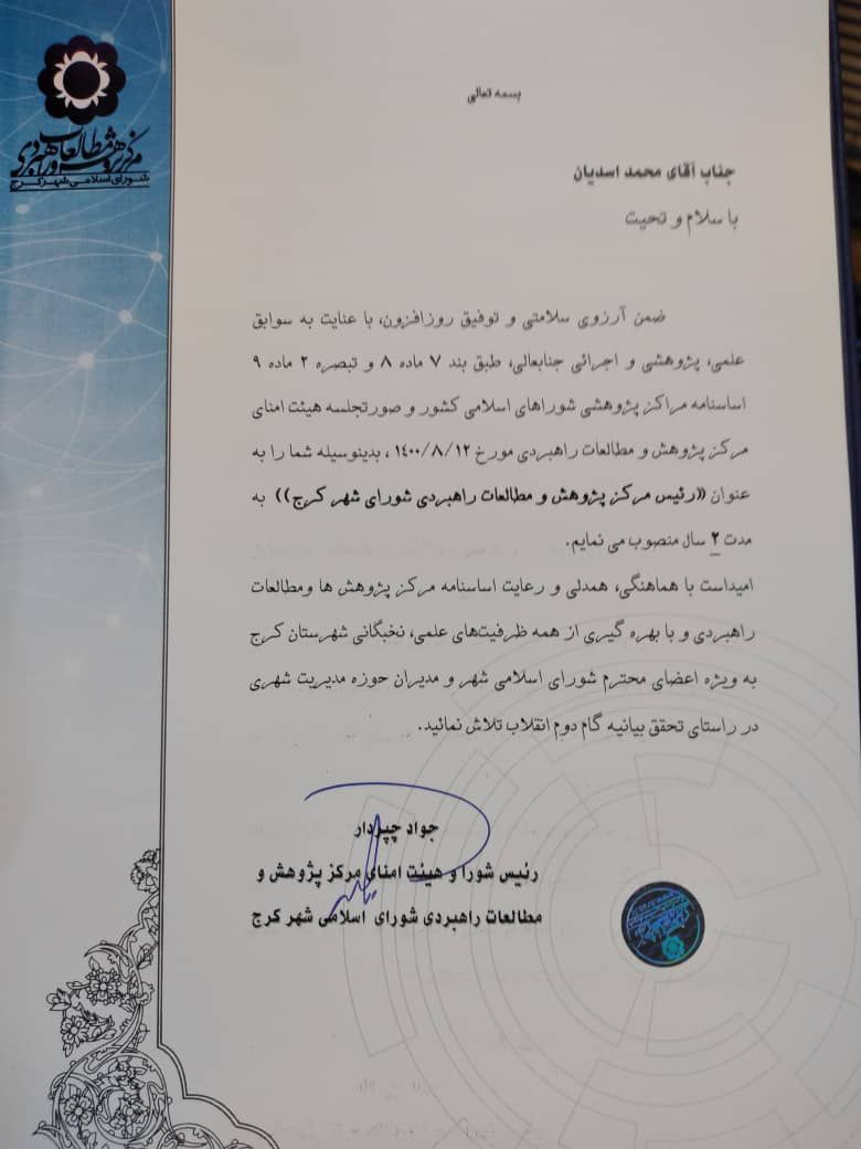 ضمن آرزوی سلامتی و توفیق روزافزون با عنایت به سوابق علمی،پژوهشی و اجرایی جنابعالی طبق اساسنامه مراکز پژوهشی شوراهای اسلامی کشور و صورتجلسه هیئت امنای مرکز پژوهش و مطالعات راهبردی شورای شهر کرج بدینوسیله شما را به عنوان “رئیس مرکز پژوهش های شورای اسلامی شهر کلانشهر کرج” به مدت 2 سال منصوب می نمایم.