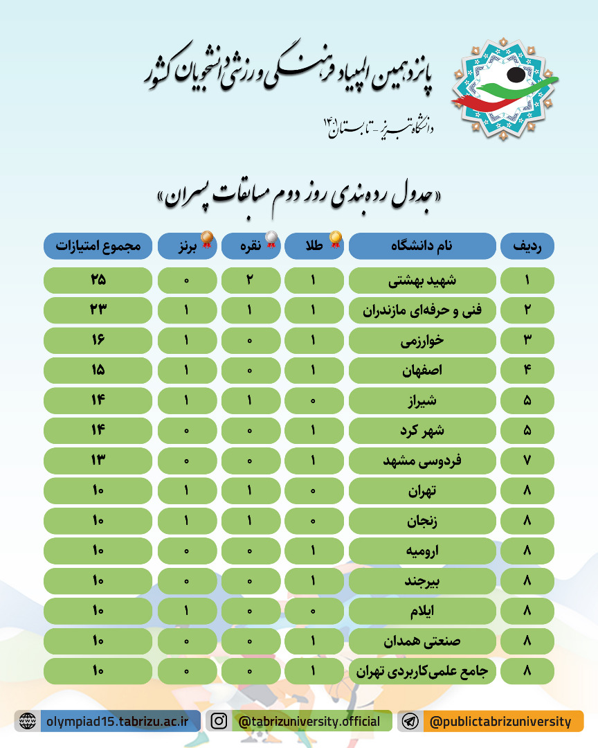 در پایان روز دوم دانشگاه بهشتی با یک طلا و دو نقره و کسب 25 امتیاز در رده اول قرار داشته و تیم های فنی حرفه ای مازندران و خوارزمی در رده های دوم و سوم قرار دارند.