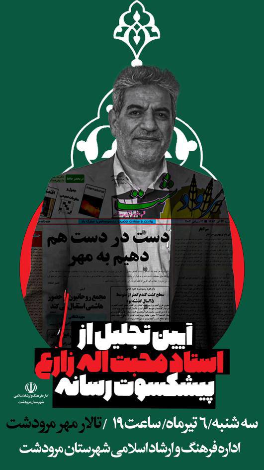 بدینوسیله از جنابعالی دعوت می نمائیم در آیین بزرگداشت آقای محبت اله زارع پیشکسوت فرهنگ و رسانه، در روز سه شنبه 6 تیرماه ساعت 19 در تالار مهر حضور بهم رسانید.