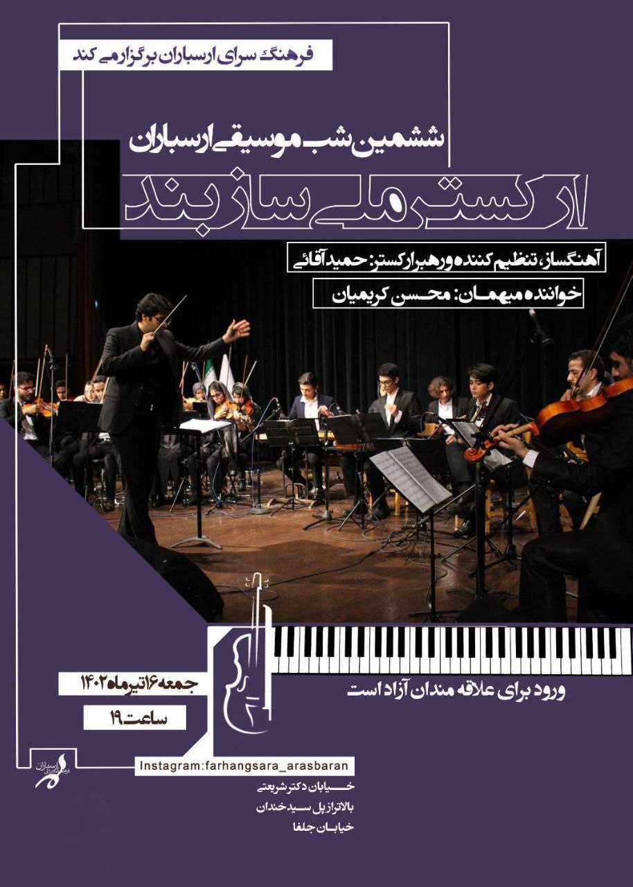 «ارکستر ملی سازبند» جمعه ۱۶ تیرماه در ششمین شب موسیقی فرهنگسرای ارسباران به روی صحنه می‌رود.