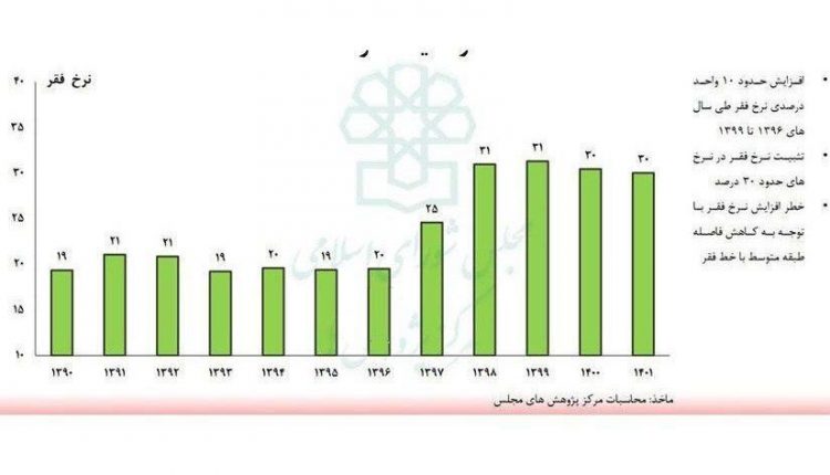 عصرآزادی/ مرکز پژوهشهای مجلس با انتشار این نمودار گزارش داد: نرخ فقر در کشور در سالهای ۹۶ تا ۹۹، ۱۰ درصد زیاد شد و از ۲۰ درصد به ۳۱ درصد رسید، ولی طی دو سال گذشته مجدد به ۳۰ درصد کاهش یافت. در عین حال خطر افزایش نرخ فقر با توجه به کاهش فاصله طبقه متوسط با خط فقر وجود دارد.