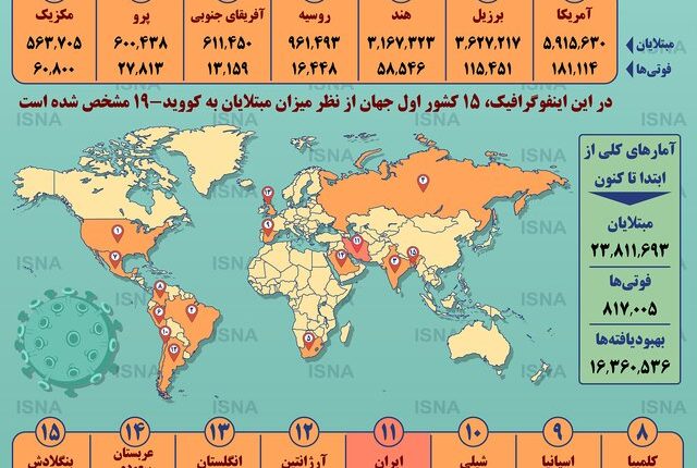 آمار کرونا در جهان پزشکیاجتماعی بوسیله Info1 به روز رسانی شده در ۵ شهریور, ۱۳۹۹ عصر آزادی آنلاین، در این اینفوگرافیک، آمار ۱۵ کشور اول جهان از نظر تعداد مبتلایان و تازهترین آمار کلی جهان درمورد ویروس کرونا را مشاهده میکنید. گرافیک: پدرام آقایی منبع دادهها: worldometers آمار کروناآمار کرونا در جهاناینفوگرافیککروناکرونا در جهان به اشتراک گذاری پرینتفیسبوکTwitterگوگل پلاسWhatsAppپست الکترونیکTelegramLinkedin