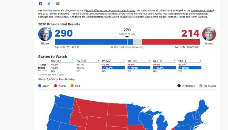 بایدن هم اکنون دارای ۲۶۴ رای الکترال در مقابل ۲۱۴ رای الکترال ترامپ است.