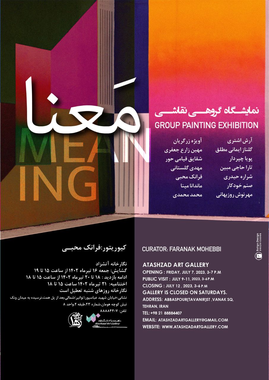 این نمایشگاه به کیوریتوری فرانک محبی (مدیر گروه هنری رها) و (مسئول نگارخانه آتشزاد) از روز جمعه ۱۶ تیرماه ۱۴۰۲ از ساعت ۱۵ تا ۱۹ برگزار میگردد و تاروز چهار شنبه ۲۱ تیرماه ۱۴۰۲ از ساعت ۱۵ تا ۱۸ پذیرای علاقمندان وبازدیدکنندگان محترم میباشد نگارخانه روزهای شنبه تعطیل است.