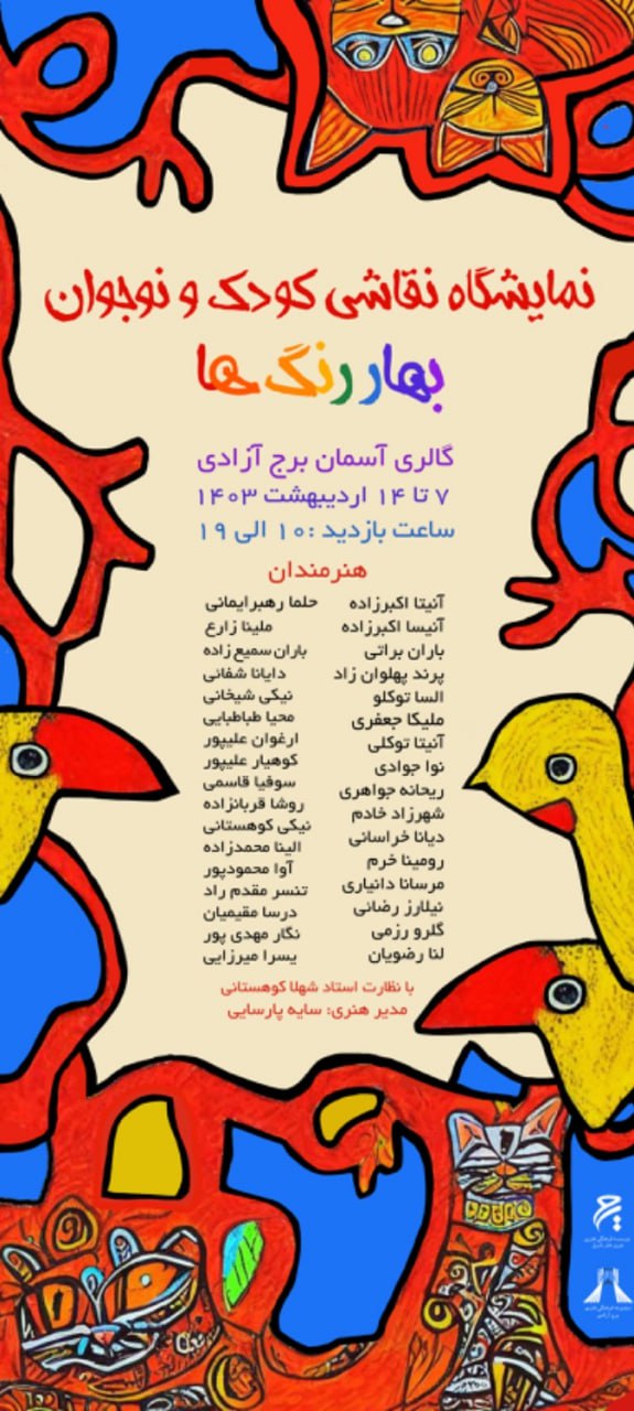نمایشگاه نقاشی کودک و نوجوان «بهار رنگ ها» روز جمعه 7 اردیبهشت در نگارخانه آسمان برج آزادی افتتاح میشود.