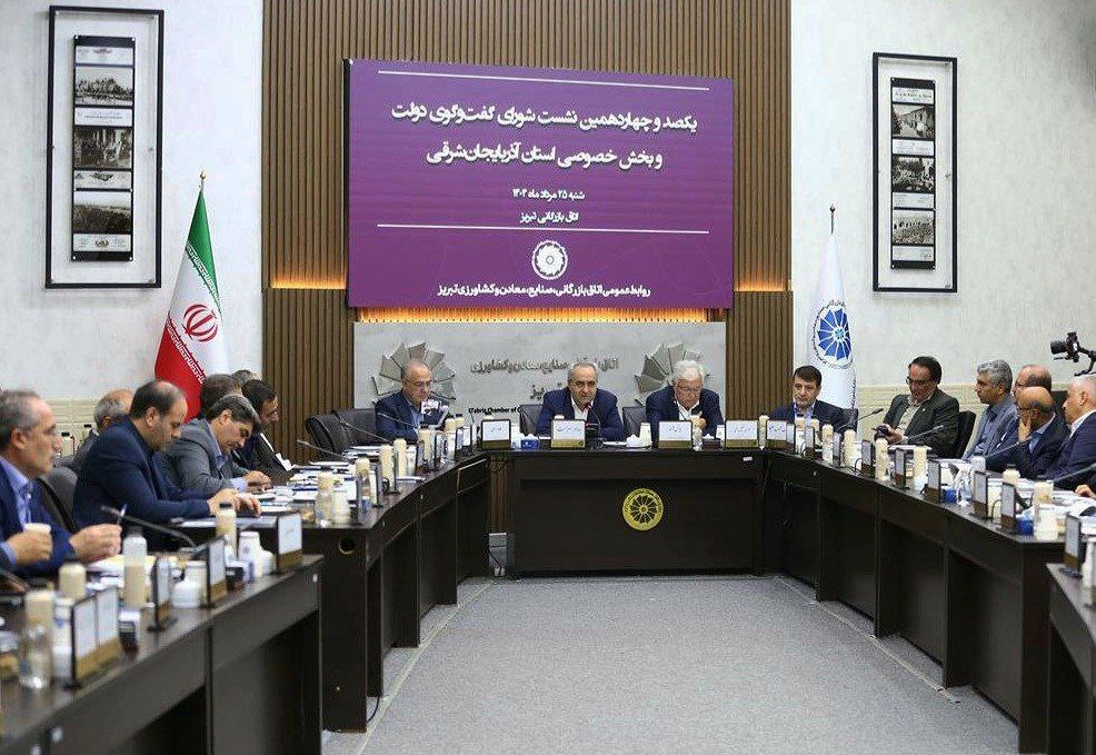 یکصد و چهاردهمین نشست شورای گفتگوی دولت و بخش خصوصی آذربایجان شرقی روز ۲۵ مرداد ۱۴۰۴ با محوریت مشکلات قطعی برق واحدهای صنعتی، بررسی عملکرد بانکها در تأمین مالی واحدهای تولیدی، بررسی موضوع کریدور زنگهزور، راهکارهای مدیریت گردشگری و غیره با حضور استاندار آذربایجان شرقی، رئیس اتاق بازرگانی تبریز، مدیران دولتی و فعالان بخش خصوصی در اولین اطاق تجارت ایران در تبریز برگزار شد.