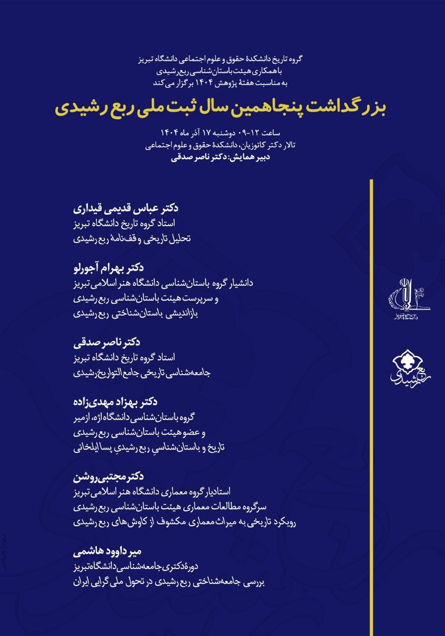 گروه تاریخ دانشگاه تبریز با حضور هیئت باستانشناسی ربع رشیدی برگزار میکند: پنجاهمین سال ثبت ربع رشیدی، دوشنبه ۱۷ آذر ۱۴۰۴ ساعت ۰۹ تا ۱۲ تالار دکتر کاتوزیان، دانشکدهٔ حقوق و علوم اجتماعی دانشگاه تبریز آخرین اخباراخبار منتخب بوسیله Info1 در 12 آذر, 1404 پنجاهمین سال ثبت ربع رشیدیربع رشیدی به اشتراک گذاری پرینتفیسبوکTwitterگوگل پلاسWhatsAppپست الکترونیکTelegramLinkedin